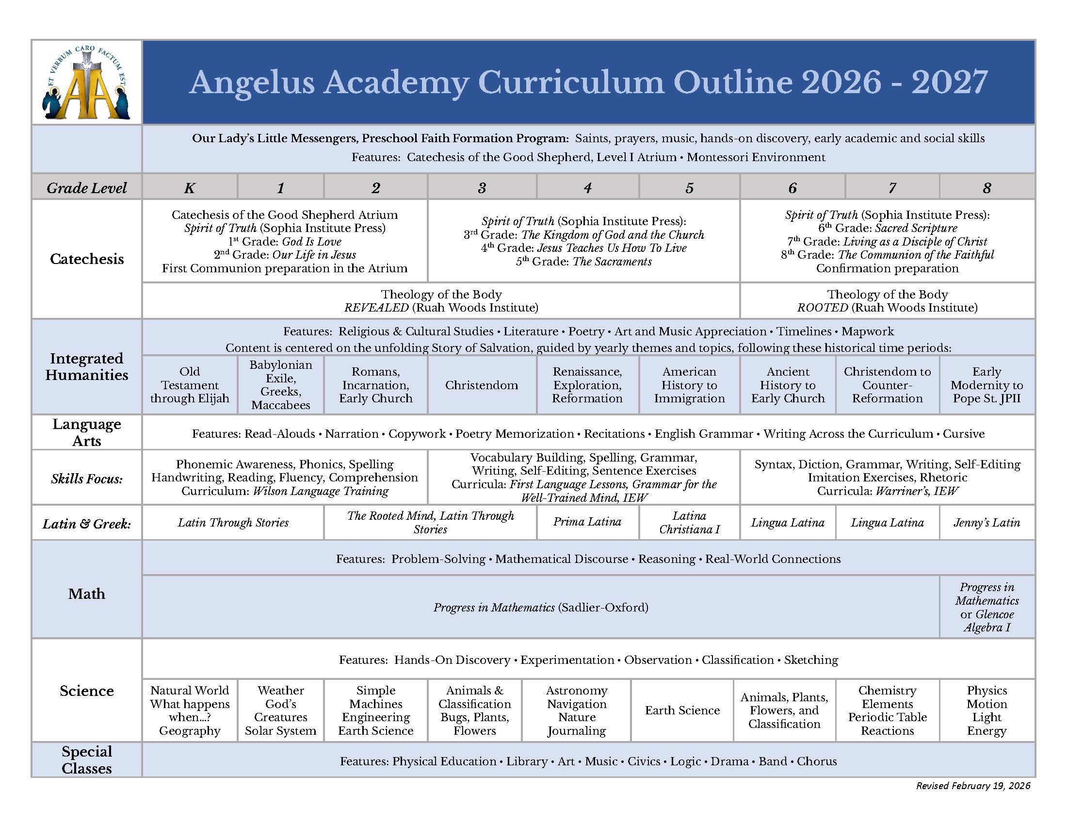 At the core of a successful school is a solid, intellectually challenging, and well-constructed liberal arts curriculum designed to “free” a student from the bonds of ignorance, vice, and wiles of the world. (“Liberal” is from the Latin “liberare,” meaning “to free.”) At Angelus Academy, we have drawn from the Catholic, classical tradition to create a liberal arts curriculum focused on integrated content, skill development, and pedagogy that support our mission. Learn about Classical Liberal Education by clicking on this video.